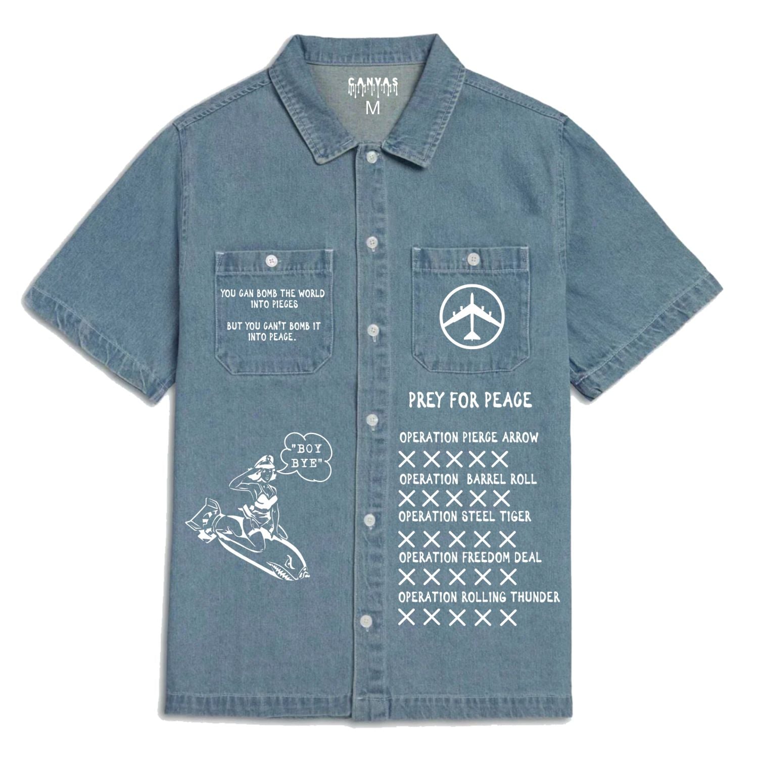 The Prey For Peace work shirt is a bold, unapologetic tribute to the overlooked history of people of color drafted into the Vietnam War. This garment confronts the legacy of the military industrial complex, turning military symbolism into a call for reflection and resistance.