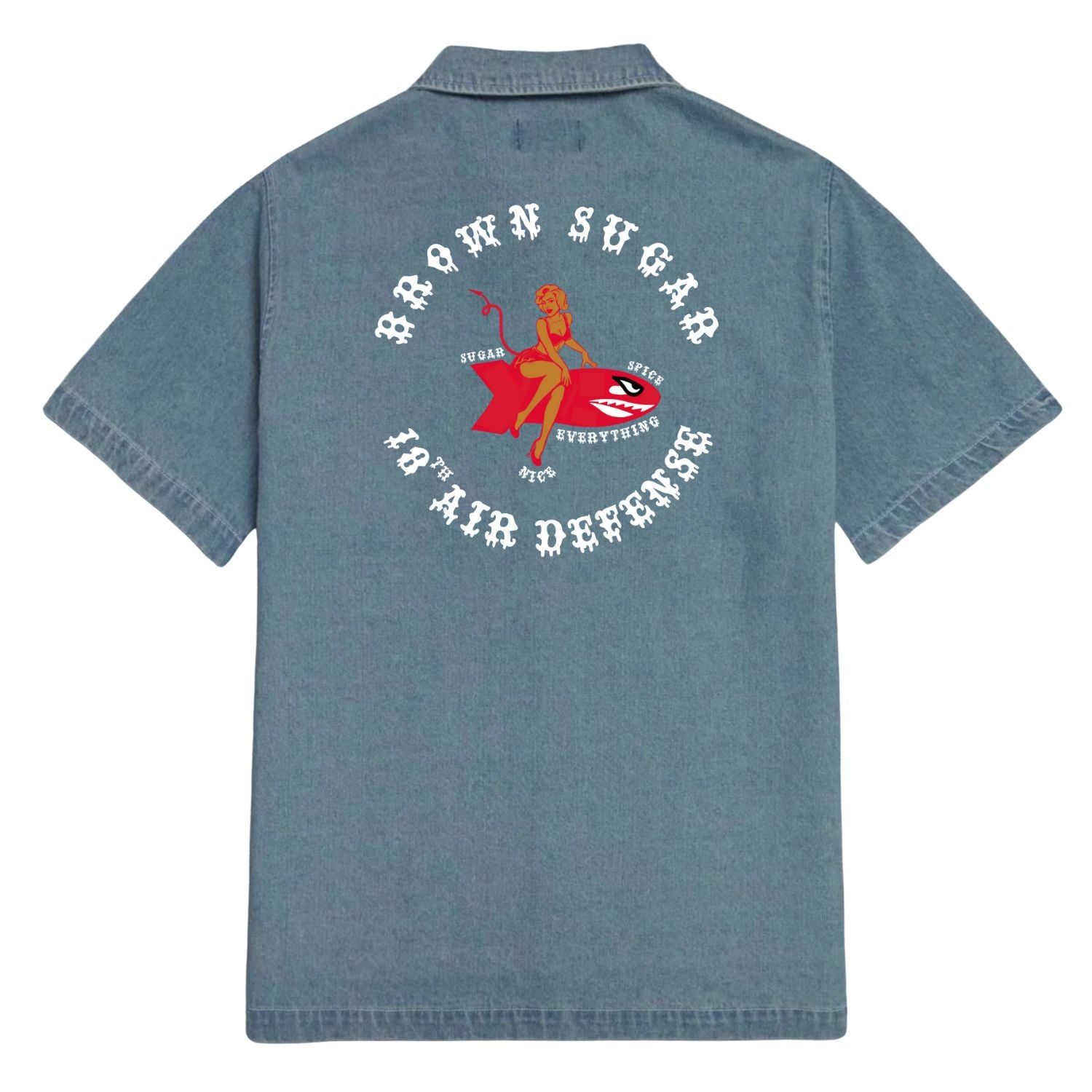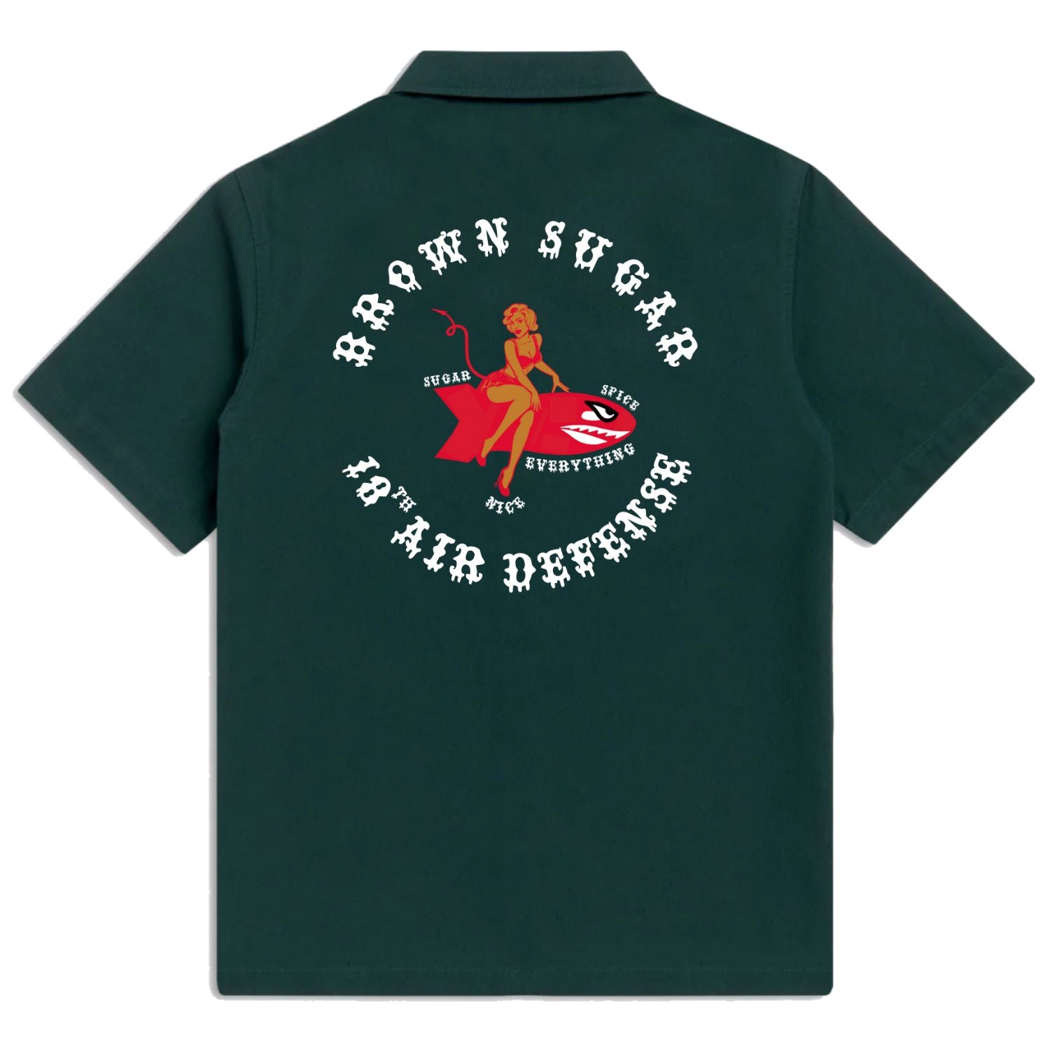 The back features a striking illustration of a woman of color in a red dress, riding a bomb painted with warhawk markings. Her devil’s tail and pitchfork heel nod to the seductive and destructive allure of war propaganda. Above her, the phrase "Brown Sugar" challenges perceptions of identity, desire, and power. The military patch-style “18th Air Defense” adds a final layer of critique and historical reference.