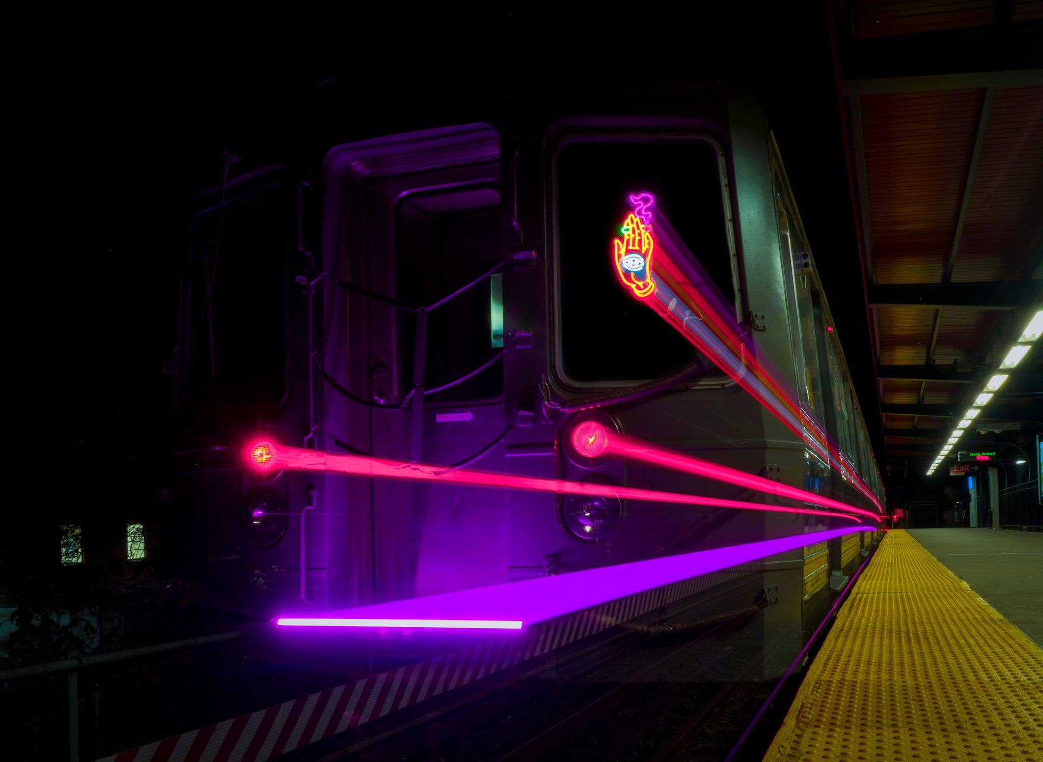 420th Street is a bold collision of color, culture, and commentary. Captured using long exposure photography, the image features a custom neon sign depicting an open hand holding a smoking joint, with an all-seeing eye illuminated in the palm. Each element of the sign glows with purpose: the hand outlined in orange (for creativity and alertness), the joint in green (for growth and ritual), smoke in vibrant magenta (for imagination and flow), and the eye in cool white (for clarity and vision).